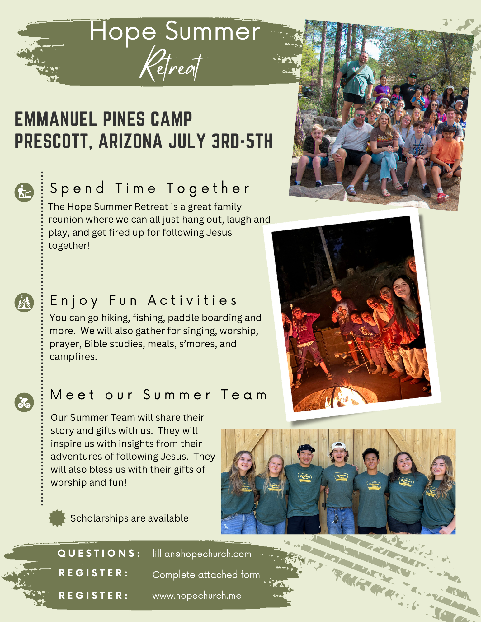 Mark your calendars to join Hope for a fun-filled weekend enjoying campfires, s’mores, worship and family time at Emmanuel Pines Camp in Prescott, AZ from July 3-5!